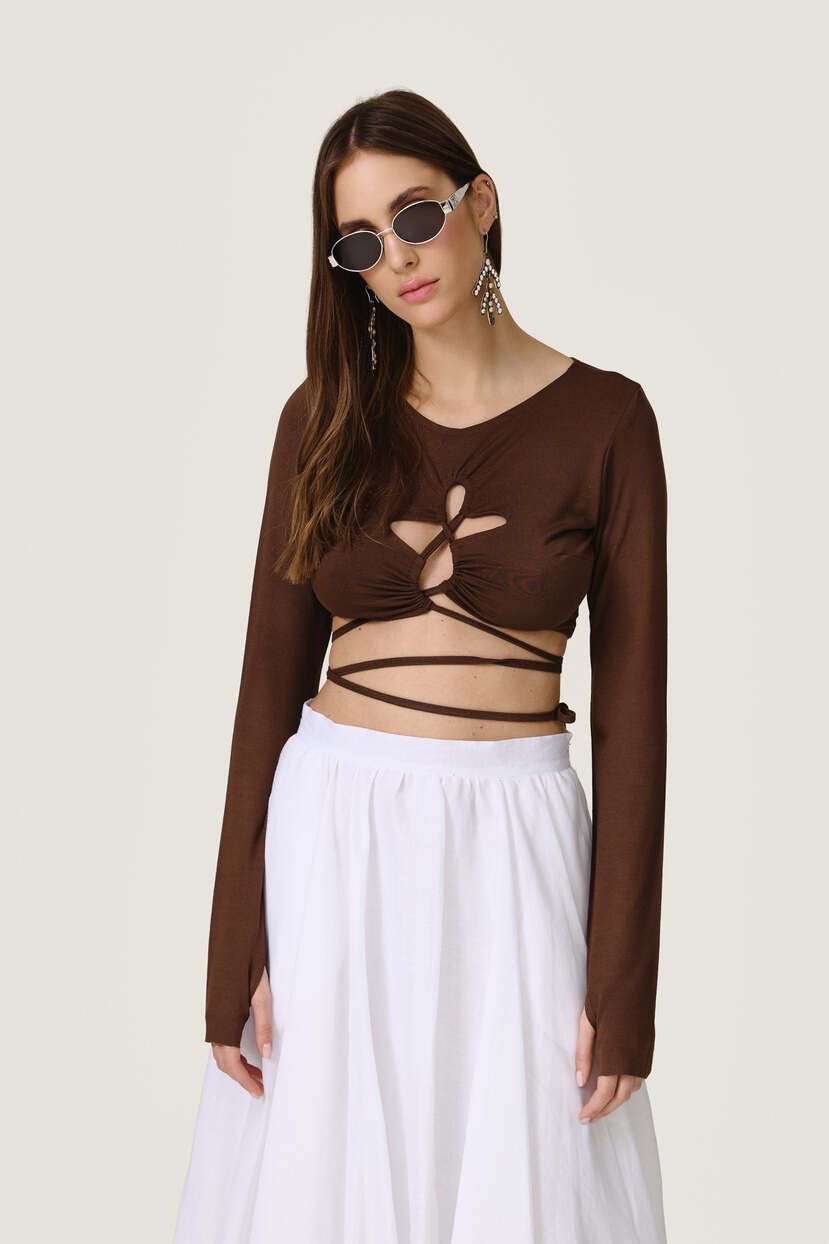 Brown Cropped Blouse With a Front Cut-Out Detail And Adjustable Lace-Up Tie