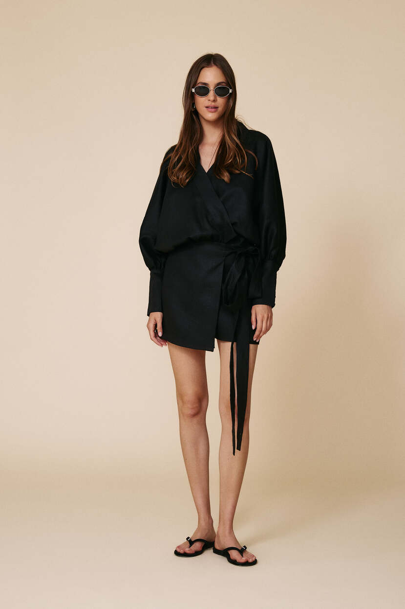 HOME - CLOTHING - Dresses - Mini-Black Lightweight Wrap Dress With Long Sleeves And Waist Tie
