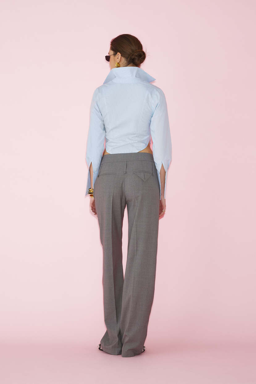 This cropped shirt in a delicate light blue shade is a modern reinterpretation of the classic button-down. With its short cut and well-defined silhouette, it accentuates the waist, adding a bold and contemporary touch. The oversized collar and long sleeves maintain a balance between elegance and edginess, making it perfect for casual-chic or smart-casual outfits.