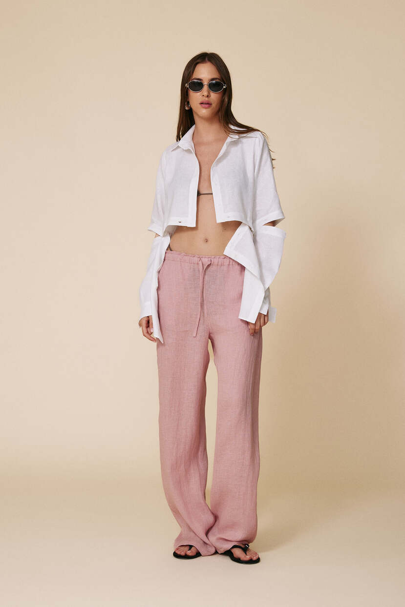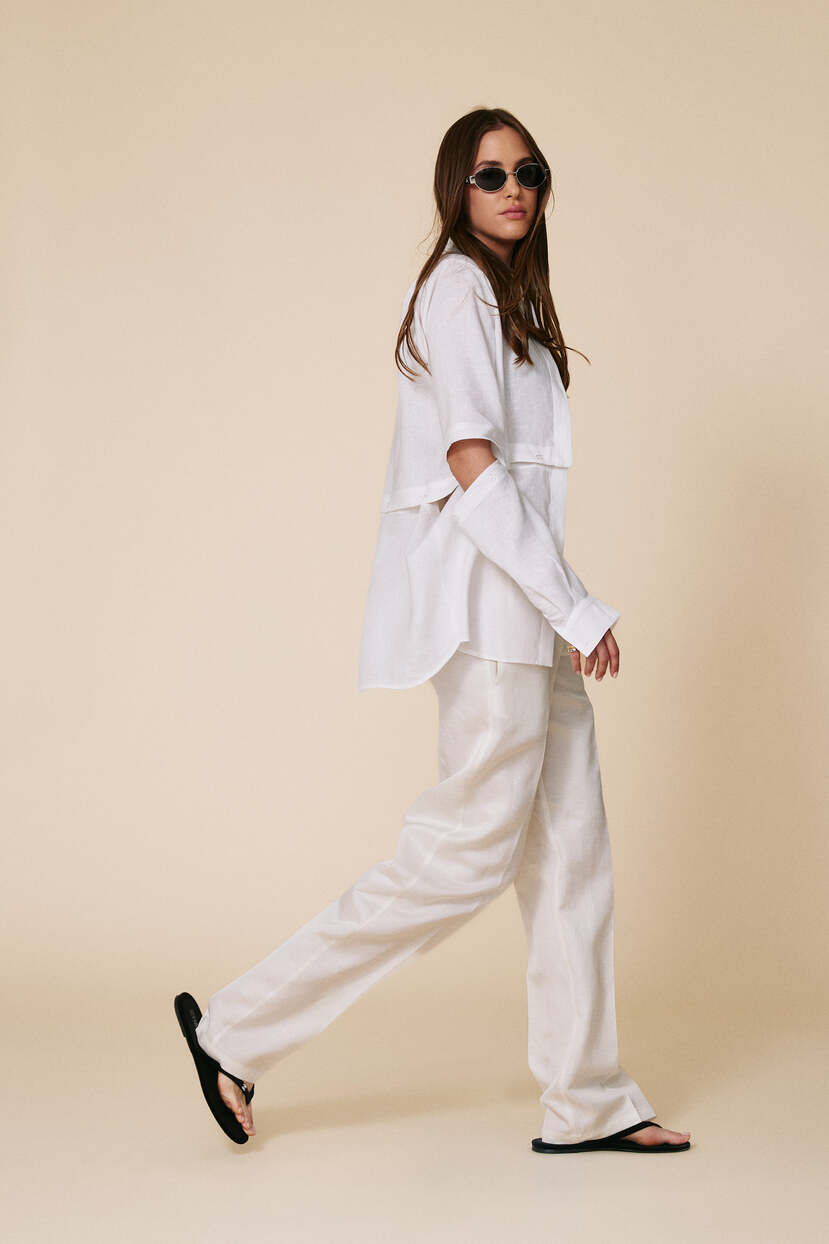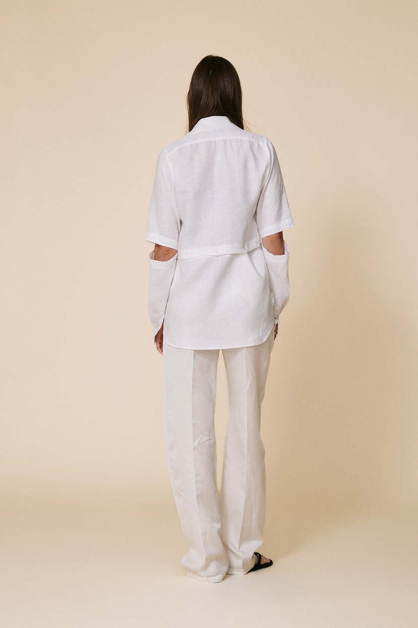 The white linen shirt is the ultimate versatile summer staple. Featuring a cropped, relaxed fit with detachable long sleeves and subtle buttons, it can be styled in multiple ways – worn open over a bikini for a laid-back beach look, partially buttoned with an asymmetrical skirt for a bold outfit, or paired with wide-leg linen pants for a breezy, boho vibe. The natural fabric ensures comfort and breathability even on the hottest days.